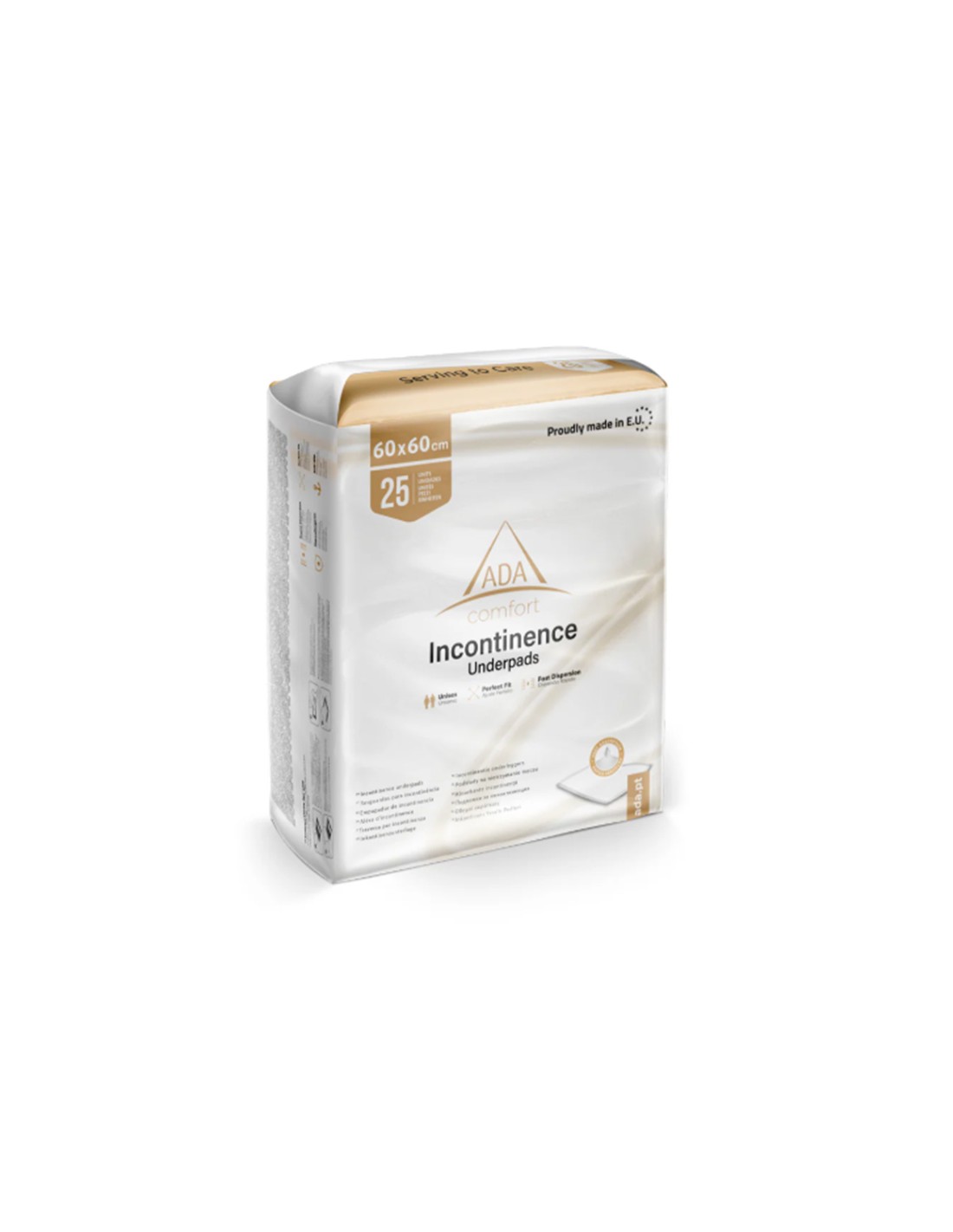 Ada Empapadores Desechables Incontinencia 60 x 60, 25 uds. Los empapadores ADA COMFORT ideales para la incontinencia. Empapadores para cama con alta capacidad de absorción y retención, con superficie antideslizante e hipoalergénicos. Poseen una elevada Resistencia a la rotura reduciendo la posibilidad de destrucción de la celulosa.