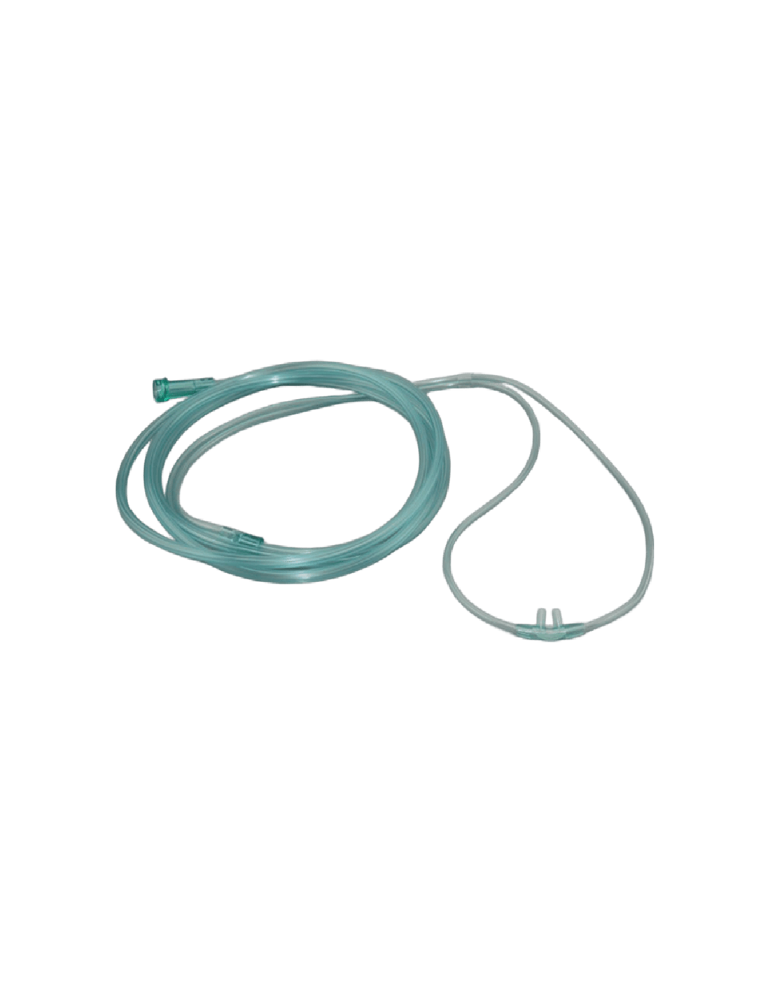 Gafas nasales de oxígeno desechable en PVC, con tubo y línea antioclusión, para uso hospitalario o domiciliario. Empaque individual.